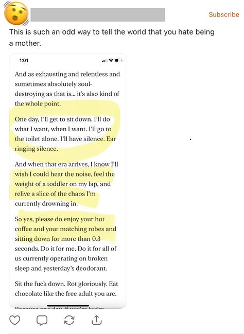 So they read “I miss sitting down” and conclude “She hates motherhood.”